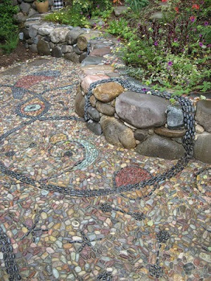 Sea and river pebbles - smooth rounded stones of different colors - this simple natural material known to all. It is very convenient for decorative sidewalks, playgrounds, courtyards, verandas, or simply as an unusual element of landscape design. Landscape designer Jeffrey Bale ( Jeffrey Bale ) sets up its mosaic of normal river pebbles and stones, which collects everywhere.Sorted by color and size, they lie in buckets and are waiting in the wings.